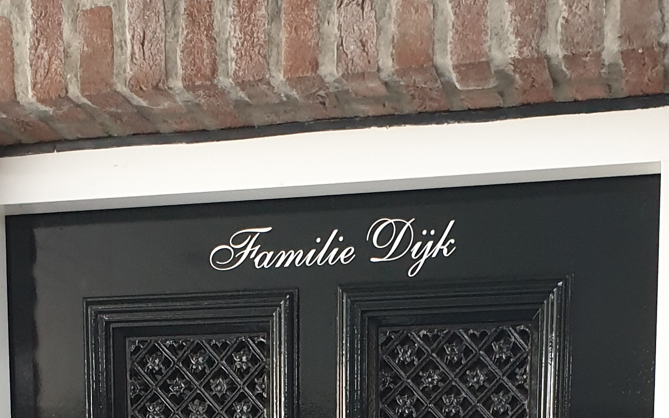 Familienaam, huisnummer of welkoms-tekst voor de voordeur.
